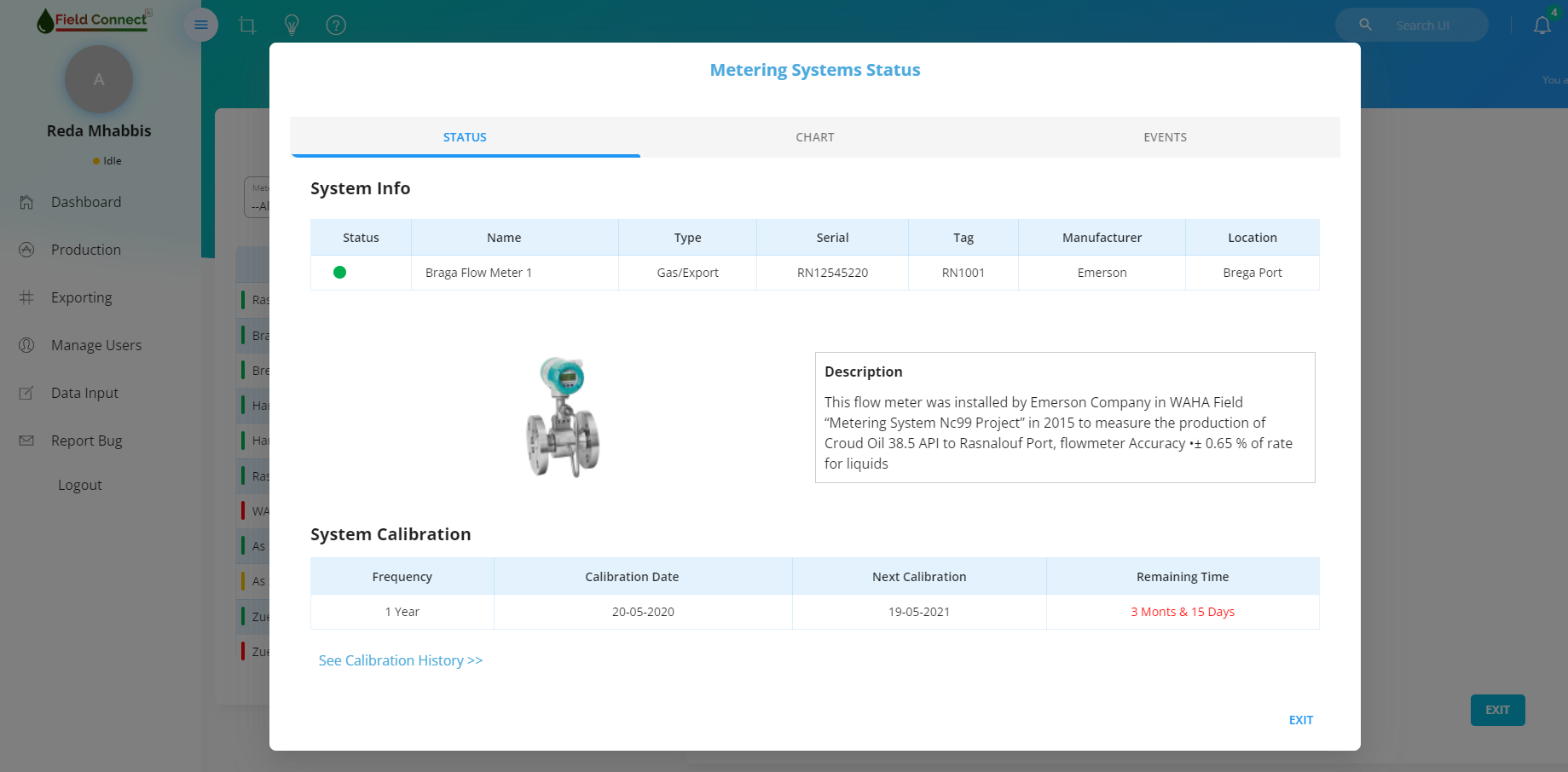 Flowmeter interface provides user with vital information about flowmeter measurements records, meter health, and calibration history. This interface is designed to reduce user distraction with overwhelming information to better perform daily tasks.